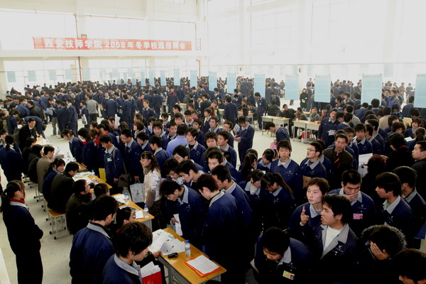學生在新校區(qū)文體中心參加百名企業(yè)校園招聘會