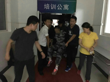(圖為學(xué)生工作處處長(zhǎng)崔嵬(右一)帶領(lǐng)工作人員和學(xué)生抬著受傷學(xué)生去醫(yī)院接受治療)