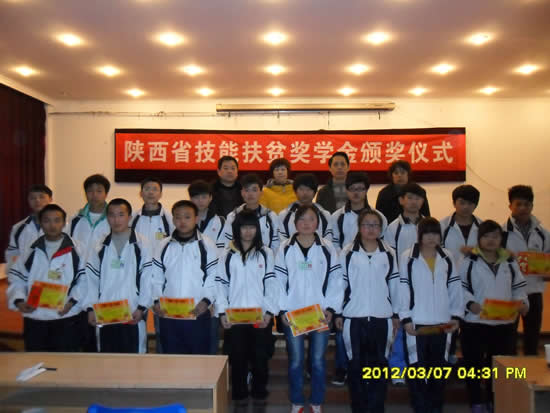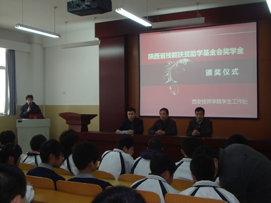 2011年3月7日,學(xué)生工作處于兩校區(qū)同時(shí)進(jìn)行了“陜西省技能扶貧助學(xué)基金會(huì)獎(jiǎng)學(xué)金”頒獎(jiǎng)儀式,旨在激勵(lì)我院品學(xué)兼優(yōu)、家庭貧困的學(xué)生順利完成學(xué)業(yè),培養(yǎng)其自強(qiáng)自立、勤奮學(xué)習(xí)、積極上進(jìn)的良好職業(yè)道德素質(zhì),為其他同學(xué)樹立榜樣。學(xué)院黨委副書記陸健安、副院長袁建章、機(jī)械工程系主任田玉芳、計(jì)算機(jī)系主任梁棟、學(xué)生工作處處長張民、副處長李智、楊坤及各系學(xué)生主管出席了此次頒獎(jiǎng)儀式。