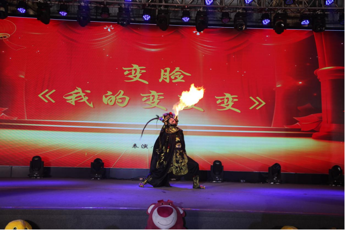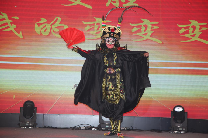 現(xiàn)代服務(wù)系學(xué)生趙特為大家?guī)砹思俭@四座的川劇變臉表演,以魔術(shù)般的技法,變幻出形態(tài)各異的臉譜,并穿梭于臺上臺下,在全場觀眾的歡呼中,演繹著變臉絕技的神奇與魅力。