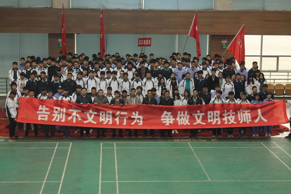 為進(jìn)一步加強(qiáng)我院學(xué)生文明行為的養(yǎng)成教育,營(yíng)造良好的校園文化氛圍,構(gòu)建文明和諧的校園環(huán)境,2016年3月16日下午,學(xué)院團(tuán)委在文體中心二樓舉辦了以“告別不文明行為,爭(zhēng)做文明技師人”為主題的宣誓儀式,學(xué)院副院長(zhǎng)楊廣明、各系學(xué)管老師、學(xué)生會(huì)干部以及各班班長(zhǎng)、團(tuán)支書共計(jì)300余人參加了本次活動(dòng)。