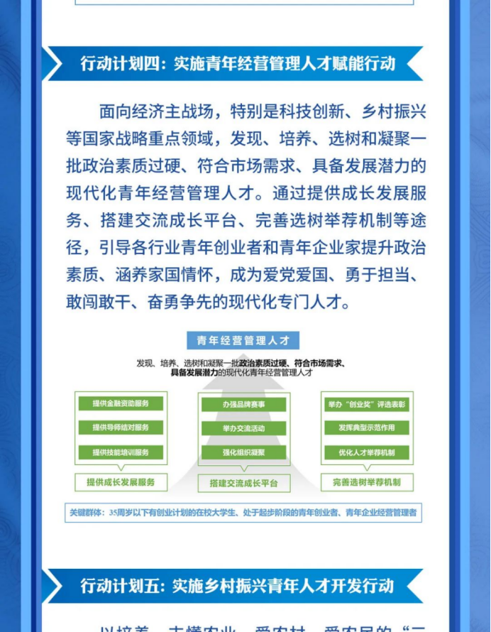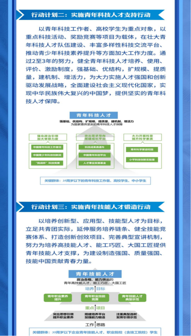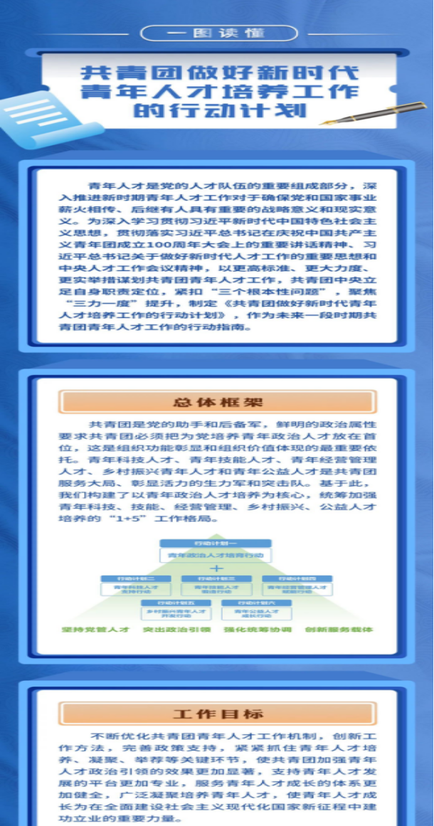 為深入貫徹習(xí)近平總書(shū)記在慶祝中國(guó)共產(chǎn)主義青年團(tuán)成立100周年大會(huì)上的重要講話精神、習(xí)近平總書(shū)記關(guān)于做好新時(shí)代人才工作的重要思想和中央人才工作會(huì)議精神。近日,共青團(tuán)中央印發(fā)了《共青團(tuán)做好新時(shí)代青年人才培養(yǎng)工作的行動(dòng)計(jì)劃》,并發(fā)出通知,要求各省級(jí)團(tuán)委、各行業(yè)團(tuán)(工)委抓好貫徹落實(shí)。