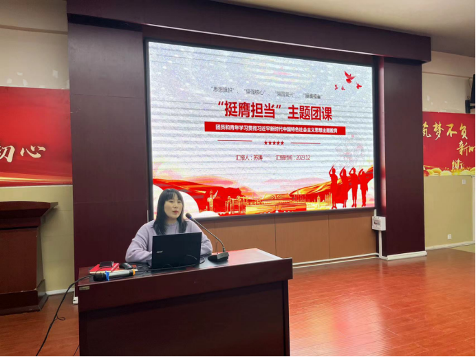 為引導(dǎo)廣大團(tuán)員青年認(rèn)真學(xué)習(xí)領(lǐng)會(huì)習(xí)近平新時(shí)代中國特色社會(huì)主義思想,扎實(shí)做好面向廣大團(tuán)員青年的主題教育,引導(dǎo)廣大團(tuán)員青年挺膺擔(dān)當(dāng)、矢志奮斗,塑造積極健康的青年文化氛圍,12月7日晚,學(xué)院團(tuán)委組織團(tuán)青代表120余人開展“挺膺擔(dān)當(dāng)”主題團(tuán)課。本次團(tuán)課由學(xué)院團(tuán)委書記蘇濤現(xiàn)場授課。