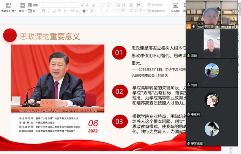 會上,韓璟老師闡述了思政課程的重要性,號召全體思政課教師勇?lián)厝?,在學(xué)院轉(zhuǎn)型的關(guān)鍵時(shí)刻,加強(qiáng)政治理論學(xué)習(xí),創(chuàng)新教學(xué)模式,緊密聯(lián)系時(shí)政,使思政教學(xué)更加系統(tǒng)化。