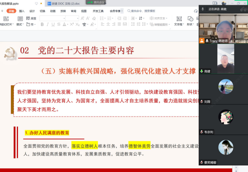 韓璟老師帶領(lǐng)全體教師認(rèn)真學(xué)習(xí)了黨的二十大報(bào)告精神,重點(diǎn)對大會主題、三個(gè)“務(wù)必”、六個(gè)“必須堅(jiān)持”、實(shí)施科教興國戰(zhàn)略等內(nèi)容進(jìn)行了闡述。韓璟老師強(qiáng)調(diào)思政課教師應(yīng)該深入學(xué)習(xí)二十大報(bào)告精髓,將報(bào)告中汲取到的內(nèi)容融入在思政課程中。同時(shí),思政課教師應(yīng)努力成為先進(jìn)思想文化的傳播者、黨執(zhí)政的堅(jiān)定支持者,努力踐行為黨育人,為國育才的初心使命。