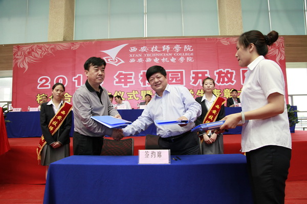 儀式上,李長(zhǎng)江院長(zhǎng)代表學(xué)院分別與陜西省電梯行業(yè)協(xié)會(huì)會(huì)長(zhǎng)金寶簽署《共建陜西電梯行業(yè)專業(yè)人才培訓(xùn)基地合作協(xié)議》、與西安騰潤(rùn)實(shí)業(yè)有限公司總經(jīng)理董學(xué)宏簽署《校企合作共建實(shí)訓(xùn)基地協(xié)議》。