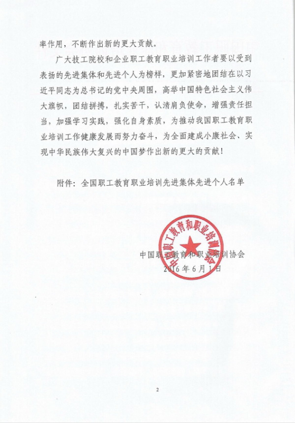 榮獲全國(guó)職工教育職業(yè)培訓(xùn)先進(jìn)集體榮譽(yù)稱(chēng)號(hào)
