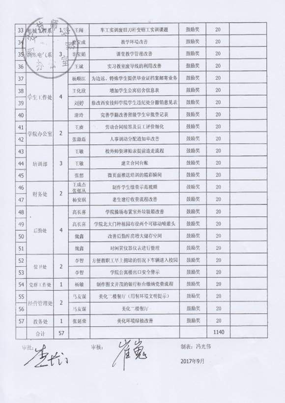 經(jīng)過個人申報,部門及精益推進辦審核后,11月6日,院長李長江對本年度9、10月份的教工精益改善“鼓勵獎”進行了審批,并特別指出,機電技術系(原工業(yè)自動化系)已從原來的增加改善數(shù)量轉變?yōu)楝F(xiàn)在的提高改善提案質量,從“量”到“質”的改變本身就是大的改善,給予了很高的評價?,F(xiàn)代服務系(原信息藝術系)提倡全員參與,系部的每一位老師都參與到精益改善當中。