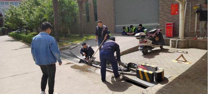 演練中,應急值班人員發(fā)現(xiàn)“汛情”后迅速上報,應急指揮部立即啟動預案。搶險救援組火速關(guān)閉積水區(qū)域非應急電源,啟動排水泵、打開排污井蓋,并在中門處堆砌隔水砂袋墻;警戒疏散組同步行動,引導車棚車主挪車、設(shè)置安全警戒線,有序組織實訓車間學生撤離并斷電;后勤保障組及時調(diào)配防汛物資,并做好汛后清潔準備。整個過程緊張有序,各環(huán)節(jié)銜接緊密,僅1小時便完成“險情”處置,全面檢驗了應急預案的科學性與可操作性。