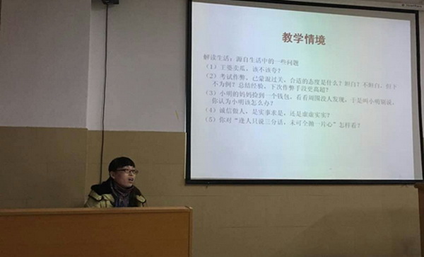 韋京利老師在講“實(shí)事求是”,韋老師繪聲繪色的情景教學(xué)法使原本枯澀的思想政治課活潑有趣、充實(shí)飽滿,學(xué)生在輕松愉快的氣氛中切實(shí)提升了自身的思想意識(shí)。