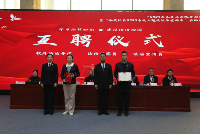 在校外法治導(dǎo)師、法治觀察員、法治宣傳員互聘儀式環(huán)節(jié),臺上領(lǐng)導(dǎo)分別為三名校外法治導(dǎo)師、兩名法治觀察員、八名法治宣傳員頒發(fā)聘書。一紙聘書,承載著沉甸甸的責(zé)任,也寄托著對校園法治教育工作的殷切期望。