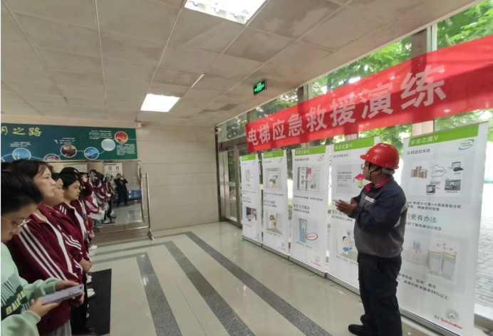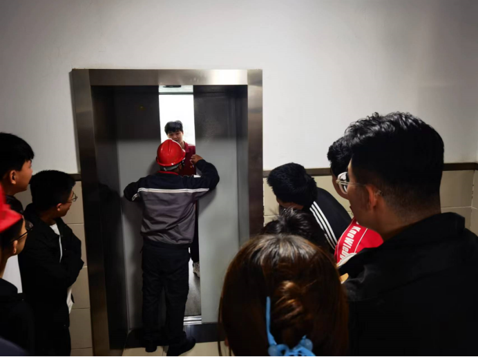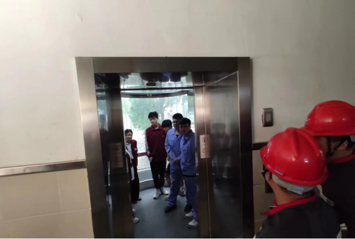 在電梯脫困演演練中,學(xué)生模擬在正常使用電梯時(shí),出現(xiàn)突發(fā)情況,電梯突然停止運(yùn)行,轎廂內(nèi)學(xué)生全部被困,被困人員撥打救援電話,現(xiàn)場老師一方面聯(lián)系電梯維保公司實(shí)施救援,一方面對(duì)被困人員情緒、心理進(jìn)行安撫,對(duì)被困人員進(jìn)行指導(dǎo),靠墻、半蹲、抱頭進(jìn)行現(xiàn)場自救。電梯維保公司接到救援電話后第一時(shí)間到達(dá)現(xiàn)場,實(shí)施救援,最后將被困人員安全解救。